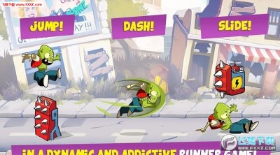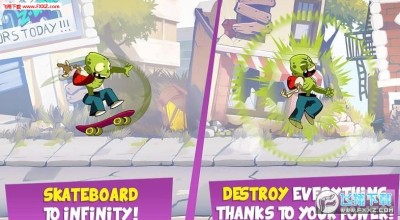 这是一款超魔性的休闲跑酷类游戏,游戏的画面还是蛮不错的,玩家需要冲刺、跳跃或者下蹲来完成挑战,操纵小僵尸踏着滑板不断前进,通过在屏幕上不同的滑动来躲避各种各样的障碍。吃下各种道具吧,同时记得也要小心身后追击你的敌人。