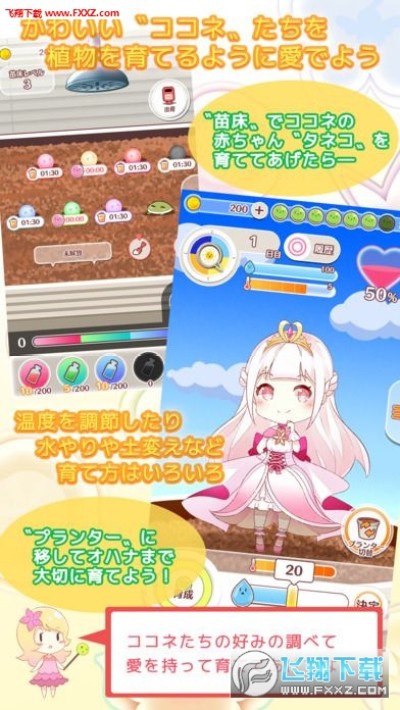 PrettyPlant手游安卓版游戏中玩家需要作为育成者,去培养在一颗和地球环境类似的行星中发现的人型植物生命体,用“爱宠物的心”去让它们成长起来。充分地去体会个性丰富的角色们带来的各种“可爱”,是本作最大的魅力之处。这些植物从婴儿成长都大人一共有三种形态,根据不同的成长,会变化为不同的外表和性格。成长过程中,这些植物会高兴、会哭泣、会发怒,各种表情同时动态展现的。玩家更可以通过双击屏幕来和植物们进行互动。