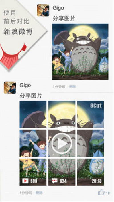 9Cut是一款把照片裁切成9块来上传后拼贴为1张大图的应用。用它你就可以告别只发布1张小缩略图而得到9张拼成的夺人眼球的震撼大图啦,实乃刷屏利器!