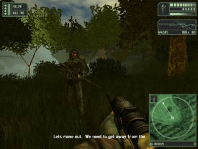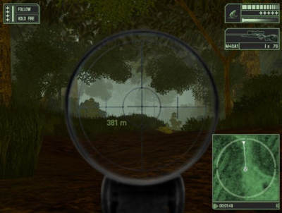 游戏中玩家扮演的是一位丛林战士,能够使用的主要武器非常有限,其中主要是型号不同的3种狙击步枪,值得一提的是游戏中对这些狙击枪的建模贴图颇下了番功夫,也是整个游戏中的亮点!次要武器就是手枪和军刀近距离的作战武器了!游戏方式也非常简单,左下方的方向地图能够告诉你接下来的行动路线,以箭头拉线的方式指引玩家继续前进,当然途中会遇到非常多的敌人,而且他们大部分是ak47, 隐藏在丛林深处的阻击手也给玩家带来潜在的危险!行进中玩家身边一直有为神勇的雇佣兵队友相助,玩家需要合理控制他的移动和攻击方式,在从林中迂回和敌人作战,当面临大规模敌人械斗紧逼时这位无敌战士才能正真发挥威力!