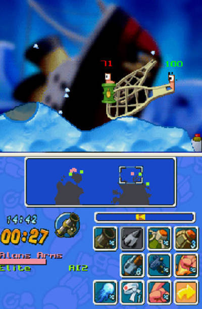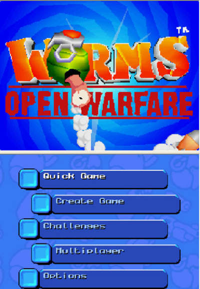DS版暂命名为《百战天虫开战(WormsOpenWarfare)》,由英国西约克郡的Team17负责制作,THQ负责发行,本作将回归原点,采用简单的2D模式表现,上屏显示游戏战场,下屏显示角色道具以及相关参数,游戏将保留系列作一贯简易的操作以及幽默风格,而且通过NDS的无线Wi-Fi功能还能支持多个玩家同时联机对战,同时收录了创建属于自己战队的模式,本作让玩家完全脱离了血腥暴力游戏的阴影而又不乏丰富的游戏乐趣。