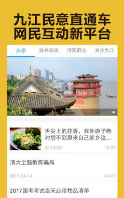 九江关注APP是九江新闻网旗下首款集新闻、社交、互动和实用信息查询于一体的客户端。是九江人民了解九江,吐槽生活,投诉咨询,交友聊天必备APP