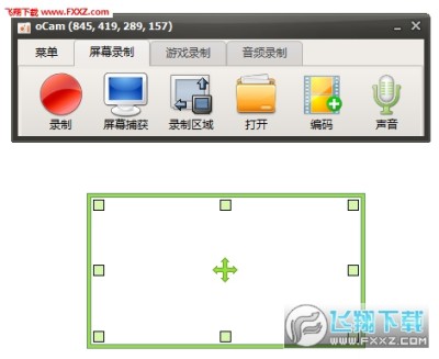 oCam 非常容易使用,启动软件后,你只需根据需要,调整要截图或者要录像的区域大小 (鼠标拖放绿色的框框的四个角),如下图,然后点击「录制」就开始录像或点击「录制区域」就是进行截图。