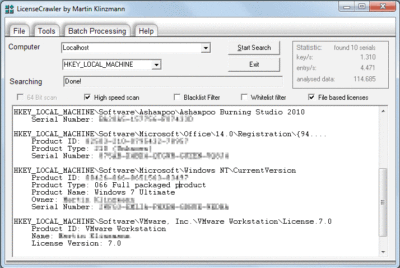 重装系统之后,可能许多软件要求你重新输入序列号或注册码。这个免费的小软件可以扫描Windows注册表,查找所有能够识别的软件序列号和授权码,速度极快。支持从Win95-Win10所有的32位和64位Windows操作系统。这款安全是安全的,不含任何广告、间谍软件和后门。你可以将其拷贝到U盘上,以备不时之需。免费永久使用,运行时会弹出安装广告,可不必理会,不影响License Crawler使用。