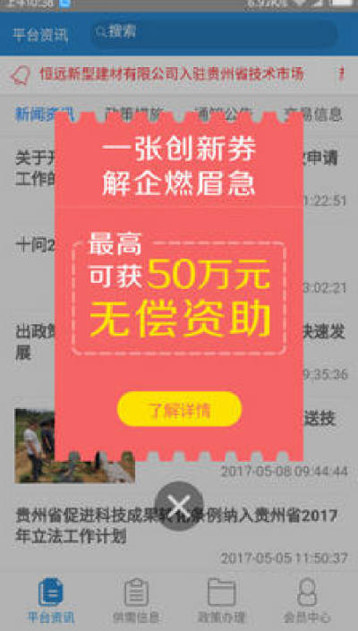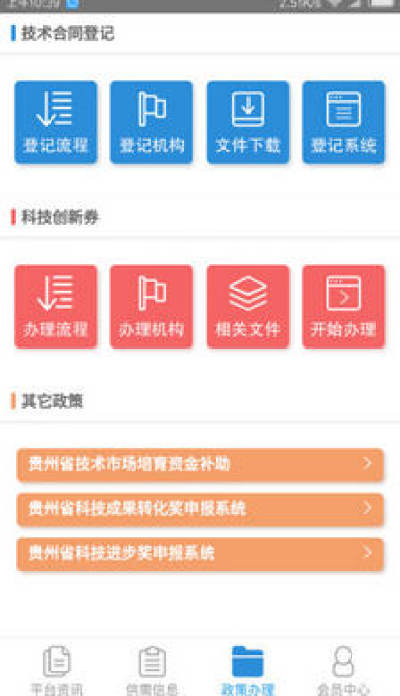 贵州技术市场APP是贵州技术市场官方网站的移动端迁移,用户可通过客户端实时的获取科技行政管理部门发布的我省技术交易统计信息及海量的技术供需信息并进行实时对接,还可以便捷的获取技术合同登记、科技创新券申领/兑现及技术市场培育资金后补助等多项优惠政策的办理途径。