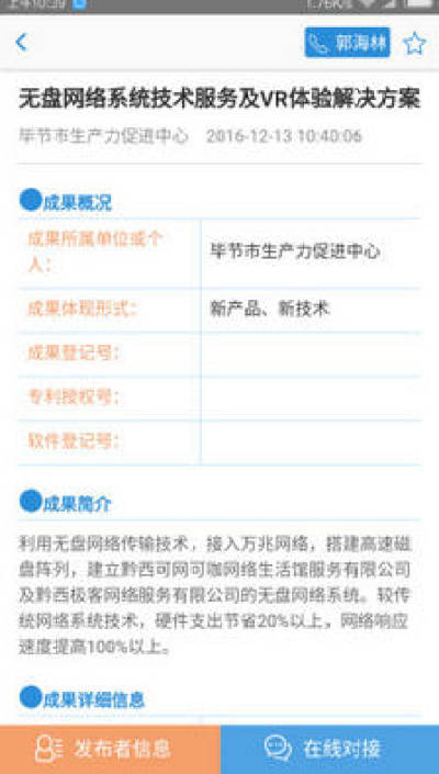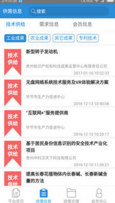 此款APP将贵州技术市场网站的主要功能进行了合理的移动端迁移,主要分为平台资讯、供需信息、政策办理、会员中心4大板块,共有20余项功能。依托移动互联网,贵州技术市场手机APP实现了人在网上走、事在网上办的功能,大幅度提高了技术交易的即时性,是促进我省技术市场发展的创新举措。