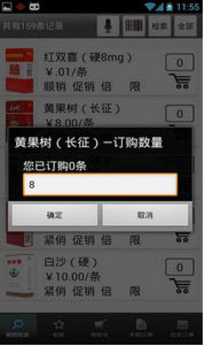 6.在输入某种烟品的订购数量时,若输入数量大于该烟品的可供量,点击确定后,手机将输入量自动修改为单品可供量。