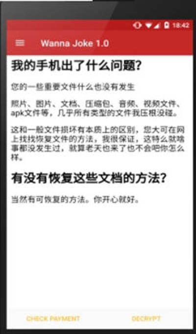 Wanna Joke(恶搞勒索病毒锁屏),最近Windows系统上真正全面爆发勒索病毒,现在正式来到安卓手机上啦,不要担心这只是恶搞。Wanna Joke app可以模拟手机中了勒索病毒的样子,可以自定义锁屏时间,感兴趣的用户们试试吧!