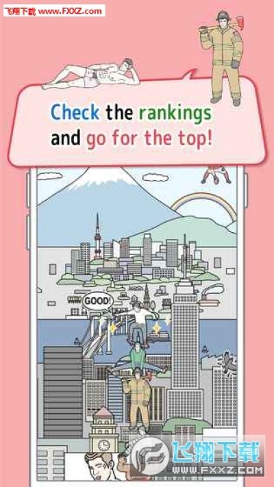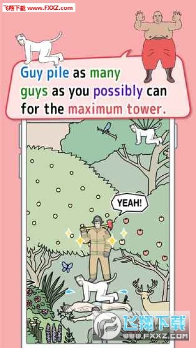 玩法很简单,点击主界面的大头,便可开启游戏。大汉会乘着降落伞从天际落下,玩家只要将它拖到白色的平台上让他站稳,以后只要不断重复拖拽动作,让大汉一个个往上累就好了。摆放的时候,要注意大汉的姿势,确保他们所累的塔较为平稳。累高塔的过程中,偶或会有纸飞机、小鸟什么的来捣乱玩家要注意及时点击清理它们。玩家如果累得够高,或者玩得次数多,将能解锁更多有趣的角色。