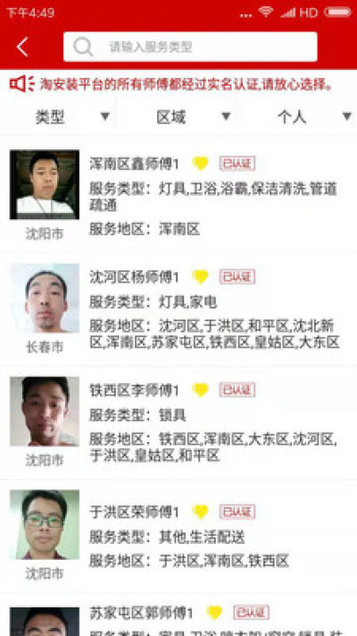 2、淘安装app的所有接单师傅和发单用户都要进行实名认证,让用户放心,让师傅更专业。