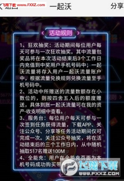 1、狂欢抽奖:活动期间每位用户每天可参与一次狂欢抽奖。其中流量包奖品将在本次活动结束后3个工作日内充值到中奖用户手机号码中;一起沃流量将存入用户一起沃流量账户中,根据流量兑换规则兑换流量至手机号码中。