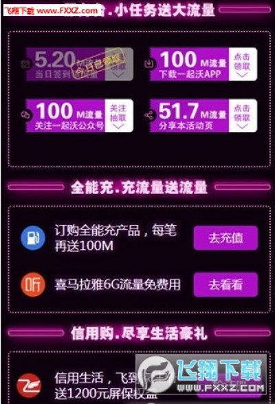 4、全能充:用户在全能充页面为本机号码成功购买带有517活动标志的价值5元或以上任意一款流量包/视频定向包/音乐定向包,即可获赠100M一起沃流量,多订多送,赠送不设封顶。赠送的流量将于24小时内存入一起沃流量账户。