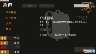《野外求生之旅 Survive - Wilderness survival》是一款模拟野外生存的游戏,游戏中玩家需要做的就是存活下去。如何支配时间,怎么获取食物都要靠玩家自行决定。游戏中也有很多工具,工具之间也有多样的联系,有些需要组合起来用。游戏中不仅仅有野外环境,还有城市、森林等多个地形,主要考验玩家的思考能力和对野外生存知识的掌握。游戏很有趣,绝对值得一玩。