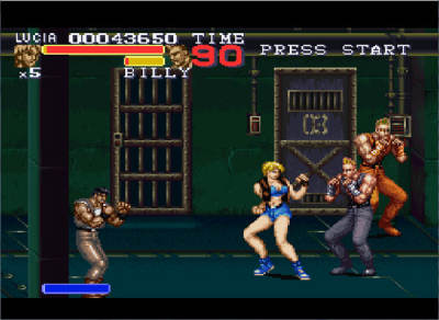 快打旋风三代改进很多,角色方面,Haggar与Guy齐齐快打,另外还增加了两位角色:英姿飒爽的Lucia与一头金色尖发的Dean(攻击方式为放电)。虽然依然沿用了“向右走,打东东”的游戏模式,但第一次,你可以在跑动中攻击。这不仅使游戏节奏加快,而且使整个游戏进程也流畅许多。游戏画面一看就知是彻底翻新过的。选择的音乐却有些弱,第一关的主题曲尤其难听。主角们还能释放出街霸式的特殊技,力量槽的加入更能使你放出超级大招。本作还隐含了不少秘密关卡和秘密房间