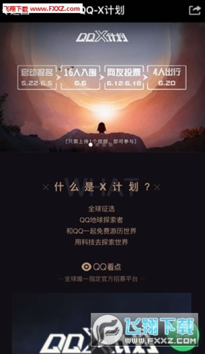 QQX计划是近期腾讯出台的全新公益社交活动,在所有的报名选手中进行在招募,来一次全球神秘的旅行,体验人类未知的大自然,同时选手们也将借助腾讯软件为大家分享这一次X计划的历程与感触,向所有用户们展现大自然的力量。
