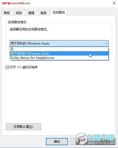 接着在「空间音效」的「空间音效格式」下拉框中选中「用于耳机的 Windows Sonic」,接着会自动将下面的「打开 7.1 虚拟环绕声」也自动勾选上,点确定就行了。