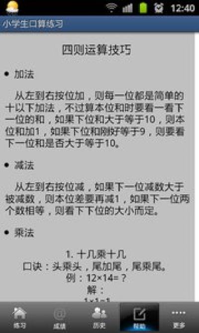 专门为小学生开发的口算、心算、乘法速算练习软件,按年级分为四等难度,加减乘除四则运算,有提示有评分有鼓掌有帮助,超级好用!儿子一用就入了迷,数学成绩有所提高1、界面大升级;2、调整了出题难度;3、添加了乘法速算题,包括单数一口清和双数一口清;4、添加了帮助。注意:要做乘法速算练习,请改变难度为普通级、神童级!