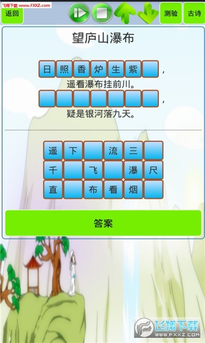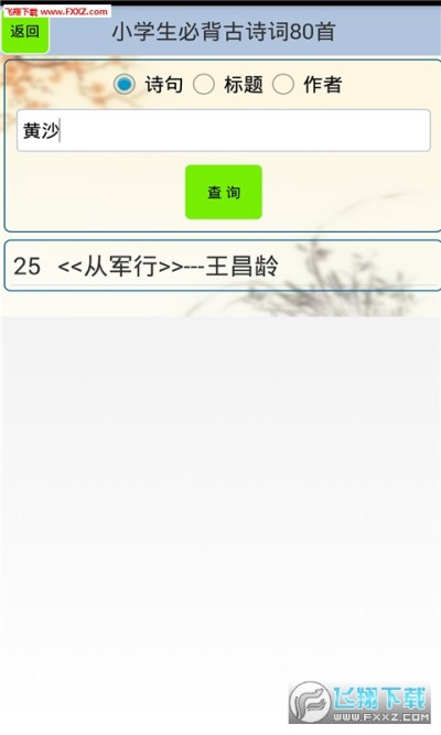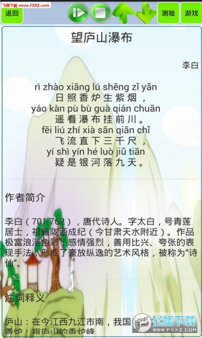 小学生必背古诗词80首(趣味版)旨在帮助小学生更加轻松的背诵古诗。软件提供的80首古诗是小学生大纲要求的。软件提供了古诗原文并标注拼音,古诗注解,赏析。并且根据每首古诗配了精美背景,和古诗文合理匹配,增加阅读兴趣。并且提供了测验和游戏两种背诵模式。除此外软件提供了按诗人,内容多种模式的查询功能。每首诗在古文,测试和游戏模式下均配有朗读。