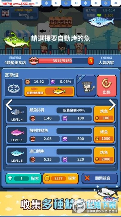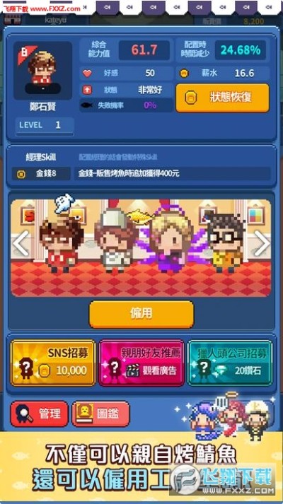 烤神是一款像素模拟经营类手游。玩家在游戏中的任务就是不停的烤鱼,然后以高价卖出~玩家还可以招聘可爱的经理来进行训练教学~感兴趣的小伙伴们欢迎下载体验哦!