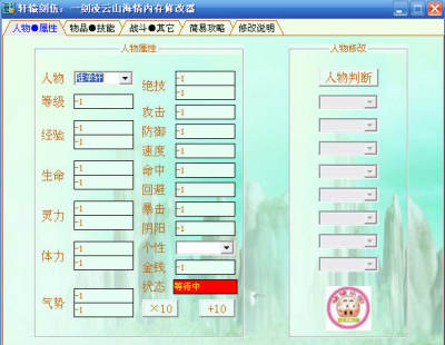 轩辕剑5一剑凌云山海情修改器是一款专门为轩辕剑5一剑凌云山海情游戏而制定的辅助工具,这款工使用很方便,功能比较强大、可以对人物的属性进行修改。看下文详细介绍。