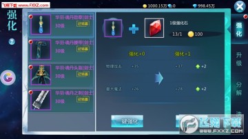 装备升级:左侧装备列表处选择想要升级的装备,右侧点击【升级】按钮进行升级,每次升级都会消耗对应数量的凤凰羽,升级成功会使装备的等级进行提升,属性会大幅上涨。