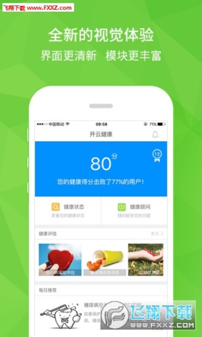 开云健康官方版是一款将抗管理应用,通过蓝牙连接血压计、血糖仪、体质仪等健康检测设备,采集数据进行分析,提供运动、饮食、心理等方面的指导,协助养成健康生活习惯。 在微信上就能看到家人的健康数据,并提供专家热线进行健康咨询和指导。