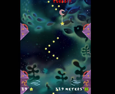 《月亮之上》的操作方法很奇特,不是单纯的跳跃,而是需要玩家来画跳板,然后月亮们便会借助跳板的力量不断上升。每一关开始时都需要玩家在两个星星之间画一条线,月亮才会落下。然后同所有跳跃类游戏一样,如果月亮掉下来没接住,就GAME OVER了。有一点需要提醒下,如果画的跳板越短,月亮们所获得的跳跃速度就越大,不同级别的跳板是以不同颜色来表示的。