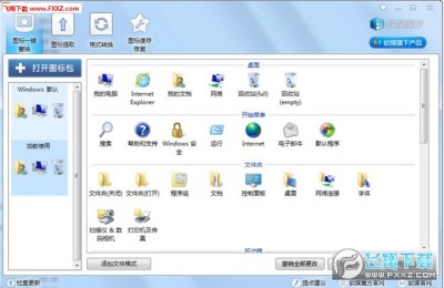 图标一键替换:替换系统默认图标,包括桌面图标、开始菜单图标、文件夹图标、磁盘驱动器图标以及一些默认的文件图标。