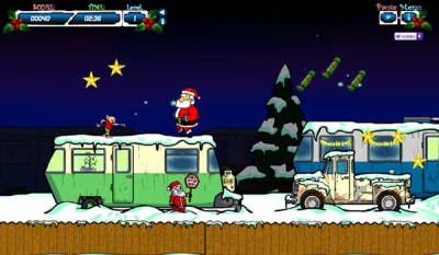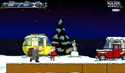 游戏玩法很特别,身为一个圣诞老人,你不仅没有驯鹿和雪橇,还得不停的躲避小偷、野狗,甚至是……外星人。