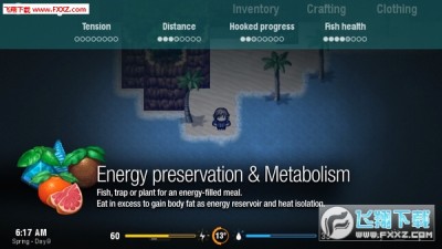 你的每一步行动和每一个动作都将会消耗能量,你只能通过摄取食物补充。如果你耗尽精力,你的运气就用完了。设置陷阱捕捉野生动物,新鲜的鱼或收获
