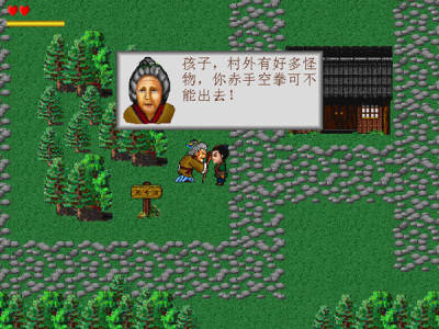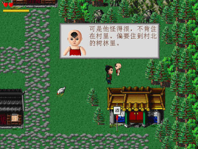 到村里与村民谈话,得知要我去解救被猴妖抓走的村民,还要救出多年前被抓走的绿精灵。邻居大姐好心地给我一个葫芦装药丸,可是我赤手空拳的,怎么杀敌呢?幸好墓地里一个老人送给我一把练功剑,并告诉我他的儿子也被猴妖所害。出村后,按照村里男孩的指点,我又跟村北的智慧老人学会了发飞镖。