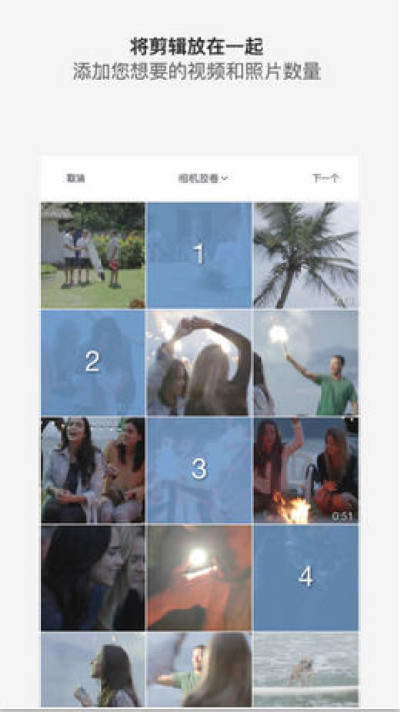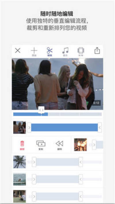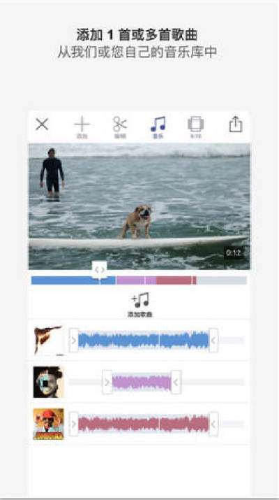 从相片胶卷中任意选择多个影片,在数秒内修剪影片、倒转影片、轻松重新安排,裁剪至全屏幕、正方形或 9:16,从 2000 万首歌中选择音乐,将歌曲加入您编辑的影片并进行分享。