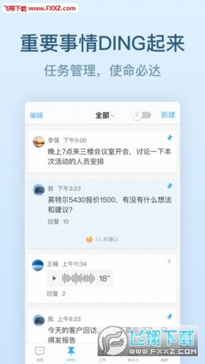 「DING」管理重要的事,不仅仅是通知催办;支持一键预约会议,会议签到,任务管理,让重要的事执行到底,不再遗忘。