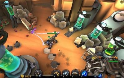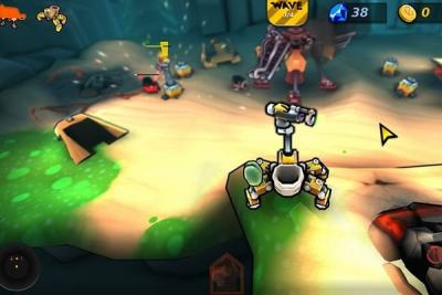 总体来看这个机器人组装炮塔游戏的画面有点漫画的风格,而且比较清晰,场景也很壮观,给人眼前一亮的感觉。在游戏中玩家控制的机器人在自己的身上安装防御武器,它的身上背着一个小篓筐,用来收集物品如(草莓、种子等),飞船主体可以用收集来的草莓生产出激光武器。机器人可将激光武器安装于四周炮塔上.