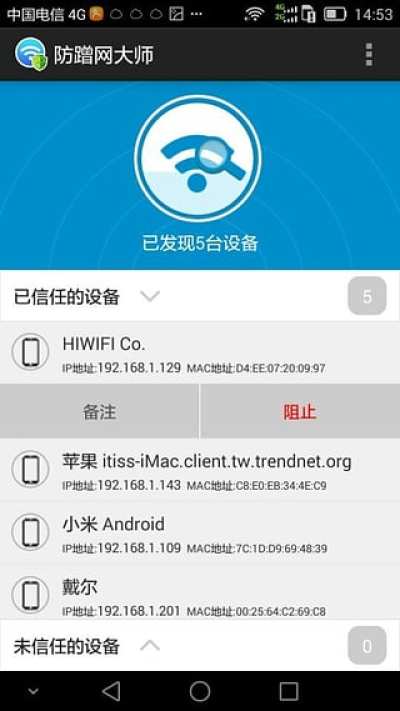 2.无需路由器管理员权限即可从本网络中剔除指定无线设备(信任操作和拒绝操作需手机ROOT)