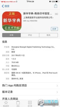澎湃新闻记者下载使用后发现,苹果ios系统版本的官方版《新华字典》APP大小共有76.6MB,系统需求为ios8.1或更高版本,在软件的logo上有醒目的“正版”字样。