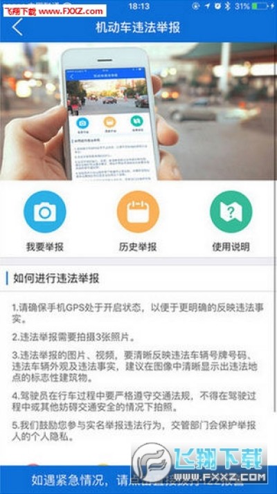 4、违法举报:群众可以通过手机APP,将机动车违法行为进行记录(拍照和视频),并上传至交管部门;