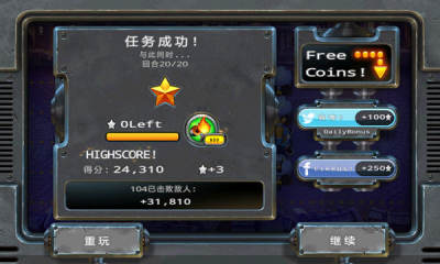 游戏的主菜单画面相当给力,各种战士以及各种战车非常逼真地全部都展现到了你面前,声音设置界面也非常炫,视觉上很舒服,提前透露一下,这款游戏的音效非常棒。音乐及音效设置画面游戏一共有4个大关,不过每个大关都非常耐玩,你需要经历一百多批敌人才能真正意义上的过关,游戏还有高中低三种难度可以选择,非常的考验技巧。游戏的操作上也非常地完善,放大、缩小、点击都非常精确。