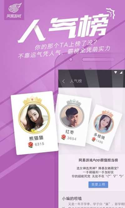 网易游戏App是为网易游戏玩家而生的游戏神器,集社交、福利、游戏排行及智能攻略为一体的游戏数据管理平台。升级打怪路上需要火力支持?使用“求交往”约小伙伴们一起玩,你不是一个人在战斗;升级不顺、装备难提升怎么办?到“游戏圈”提问,各路大神带你游戏带你飞;游戏中谁是大神谁是女神?人气榜让你第一时间了解近期游戏红人。