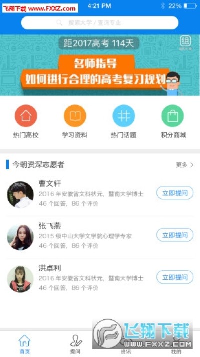 今朝升学app是一款帮助大家填写志愿的app,为大家提供最新的高效招生信息,全方位的为你解读各个大学的校园情况,帮你挑选出心仪的大学。今朝升学app还可以在线提问,学姐学长会为你答疑解惑,需要的朋友可以下载使用。