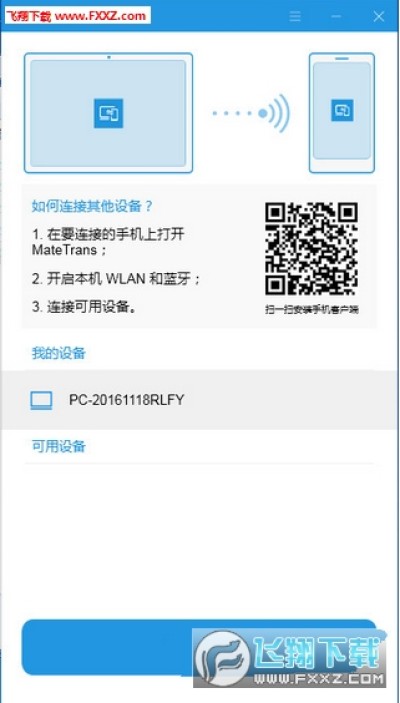 连接时,需在要连接的设备上打开MataTrans且打开MateBook的WLAN和蓝牙,点击可用设备进行连接