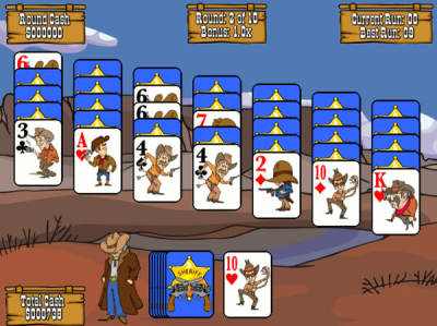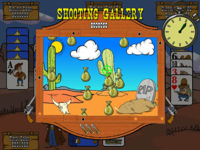 枪手纸牌是大鱼公司发行的一款纸牌类的游戏,游戏中的纸牌是以西部牛仔为主题,每张纸牌上都画着卡通的牛仔形象。同时游戏中有一张特殊的钱袋牌,找到它,就会开始一个射击钱袋的小游戏。游戏的规则很简单那,以下面牌组的点数为基础按照顺序将上面的纸牌收下来,正序反序都可,随时可以更换顺序。在下面的牌组翻完之前,尽可能多的回收上面的纸牌。