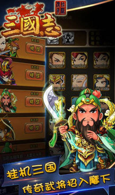 三国志挂机传奇是一款创意三国对战类手机游戏,游戏中玩家可以享受到最具趣味的三国对战玩法,与众多Q萌的三国武将并肩战斗,开启=独特的冒险之旅吧!