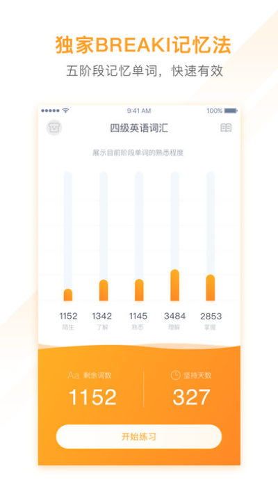 不同于传统背单词应用,有道背单词独创的BREAKI记忆法将艾宾浩斯记忆曲线与LeitnerSystem的五盒理论相结合,将单词按照熟悉程度划分为 5 个状态,即“陌生-了解-熟悉-理解-掌握”,对学习者的关键遗忘临界点进行精准判断,从而根据不同临界点进行新旧单词组合背诵复习,巩固记忆。