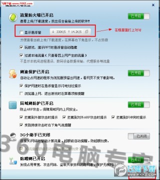 【360安全卫士】—【功能大全】—【流量防火墙】—【扳手按钮】—勾选【显示悬浮窗】—【确定】