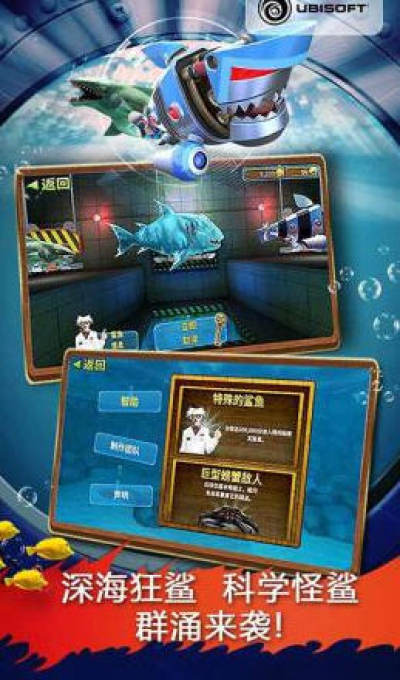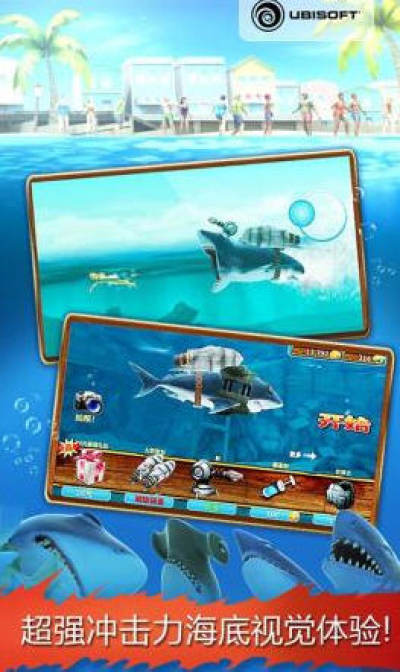 游泳当心!比从前更饥饿的鲨鱼回来了!快节奏的弱肉强食游戏!育碧软件大作,继饥饿鲨鱼1-3之后,全球2500万下载,现已来到中国! 体验作为鲨鱼的终极生存挑战,畅游3D世界,在充满惊奇与危险的多样水下世界觅食。掠食各种鱼类、游泳者、渔夫,从幼仔成长到10吨的大白鲨!与其它鲨鱼、潜水艇、以及更多奇奇怪怪的深海生物作战,获得高分! 完成50个任务,寻找宝物取得金币与宝石,用来升级你的鲨鱼或者购买特殊救生道具。逐渐解锁更多水下凶猛野兽:灰鲭鲨、锤头鲨、虎鲨和无敌的大白鲨!