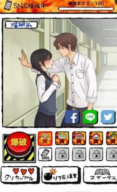 本作的玩法为放置类,情侣会不断在学校、电车、公园等令死宅们充满孤独感的场景中出现,玩家只要点击情侣就可以炸掉他们,连续轰炸密集的情侣还可以形成Combo(此处应有掌声)。只要满足每关消灭情侣的数量,攒满能量条,就可以按下“爆炸”按钮,看仙人是用怎样新(丧)奇(狂)的方法调教卿卿我我的情侣们,实在是大快人心!不过情侣的刷新速度比较慢,玩家既可以切出等待一段时间,也可以点击“秀恩爱”按钮主动招募情侣前来送死,不过一不小心就会点到周围密集的广告,这也算是为制作者做贡献吧。