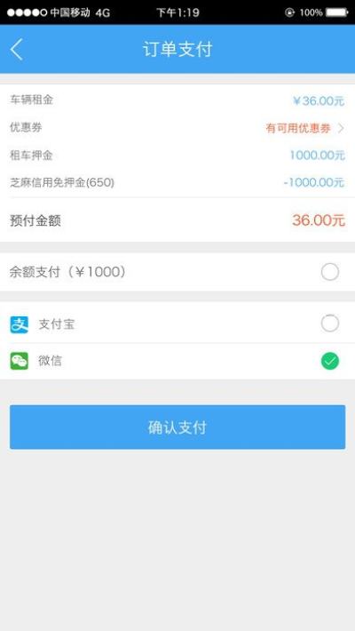 打开APP选择立即用车,输入用车时间后,页面弹出了一个提示框,显示租金为每小时10元,押金1000元,可以通过支付宝或者微信支付;