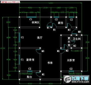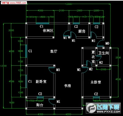 窗定位:算出窗中心点位置,用 和 画出辅助的轴线;再使用 ,选择窗宽度,在正确位置插入窗。(C1 窗宽 1800,C2 窗宽 900)关闭轴线的图层检查一下: