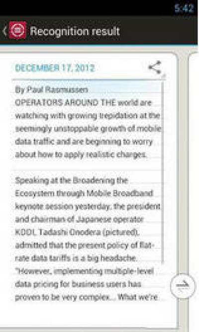 - 在应用程序内将识别的文本发布至 Facebook、DropBox, Twitter 和 Evernote